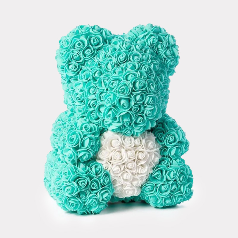 Dieser einzigartige Rosenbär ist aus hochwertigem mintgrünem Plüsch gefertigt und sorgfältig handgefertigt, um eine hohe Qualität und Haltbarkeit zu gewährleisten. Der Bär ist mit künstlichen Rosenblüten in einem erfrischenden Mintgrün bedeckt, was ihm ein charmantes und einzigartiges Aussehen verleiht. Das Herz, das der Bär in den Händen hält, besteht aus roten Rosenblüten und symbolisiert Liebe und Zuneigung.
